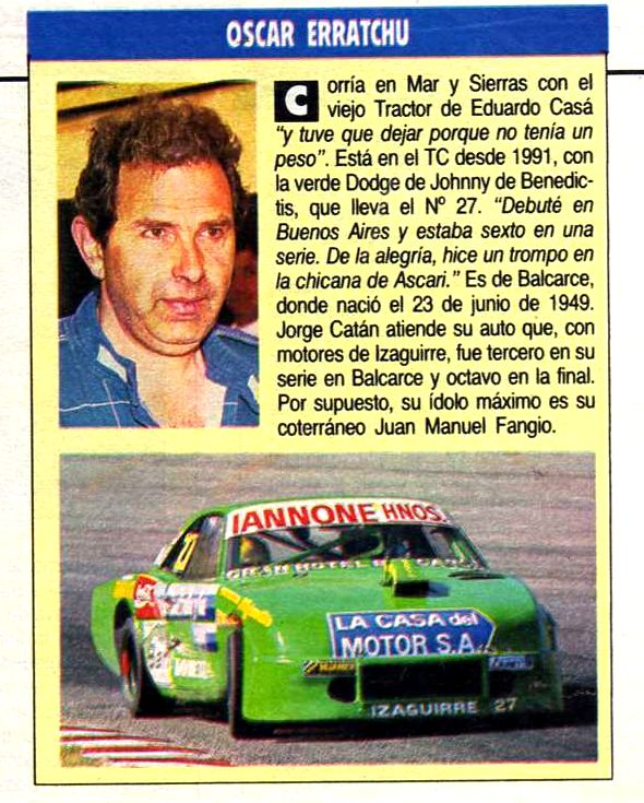 Oscar Erratchu se crió aquí en las chacras donde fue tomándole gusto a la mecánica. Luego incursionó como piloto, debutando en 1969 en cafeteras con la preparación de Harry Van Vliet, pasando a ser uno de los principales animadores de la categoría.